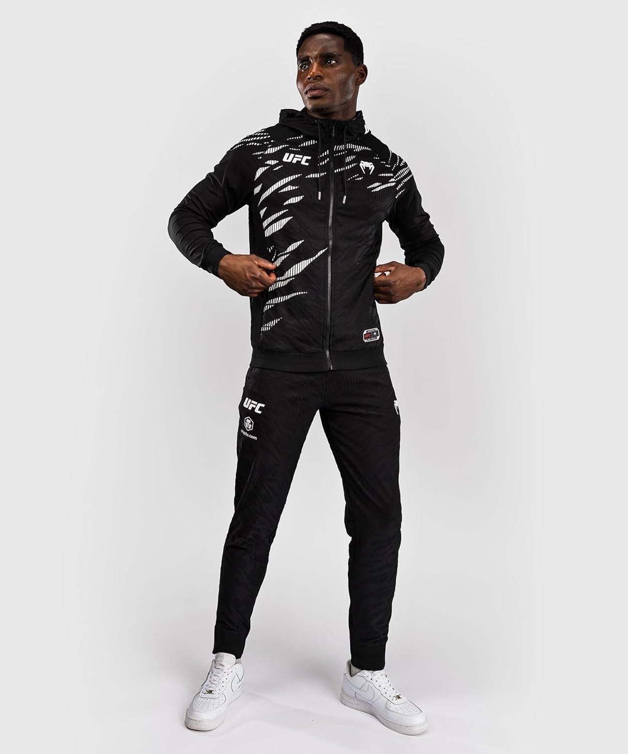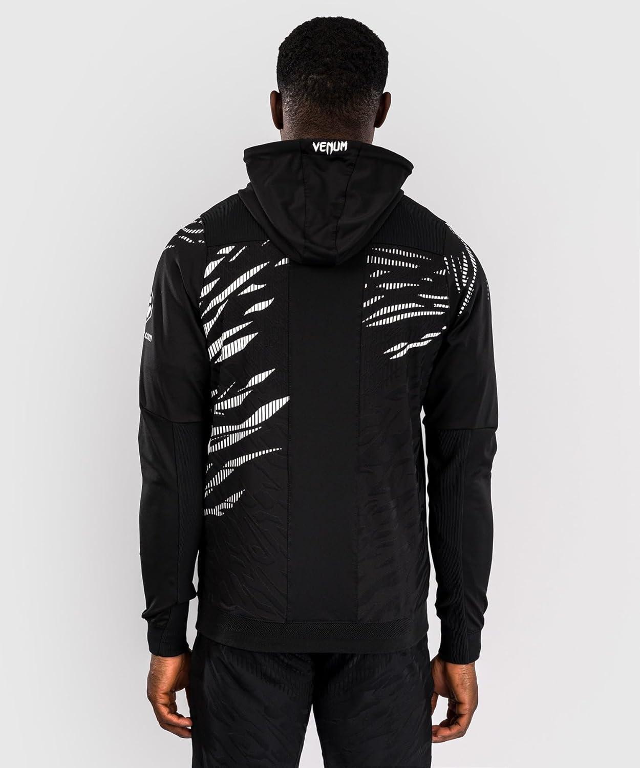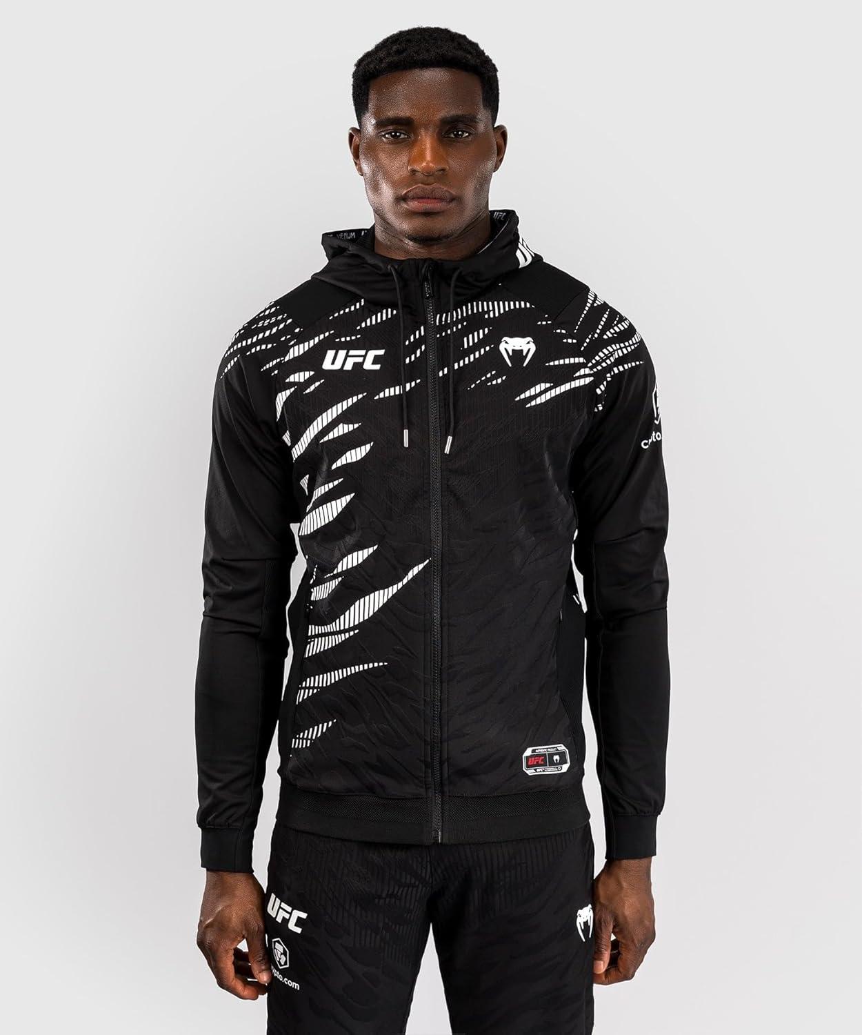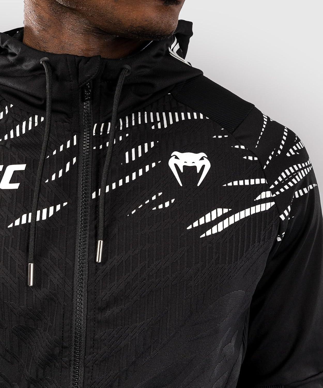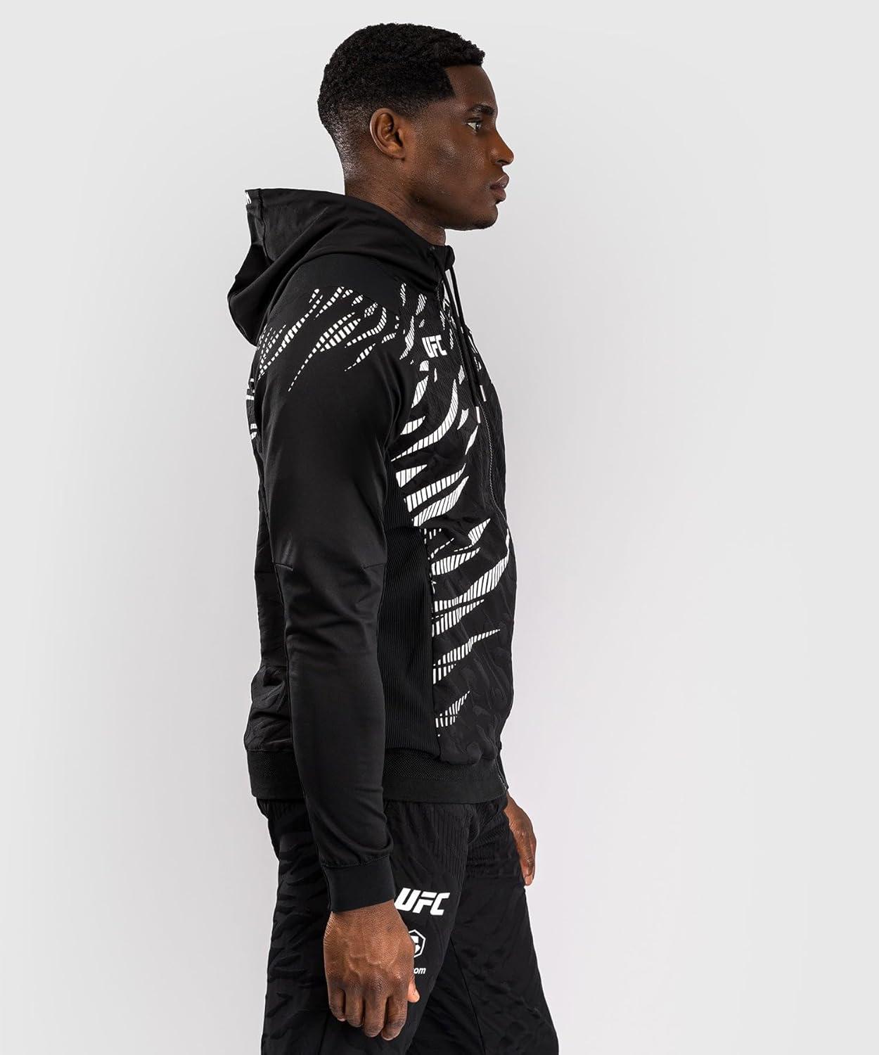 Introducing UFC Fusion by Venum, a full apparel and accessory range fusing sophisticated performance fabrics and primal design elements. Each piece in this authentic UFC Fight Night collection was created to match the needs of competing UFC athletes by using exceptionally durable, breathable fabrics and thoughtful detailing. Jacquard animal print invites athletes to connect with their deepest primal instincts to prevail in the Octagon. The UFC Fusion by Venum Authentic Fight Night Men’s Walkout Hoodie features two zipped pockets, plus a mesh-lined hood with adjustable drawstrings. The wrists and inner panel of the arms are made with a premium stretch fabric, to allow athletes to take off their hoodies without removing their gloves. When the stakes are at their highest, go primal.