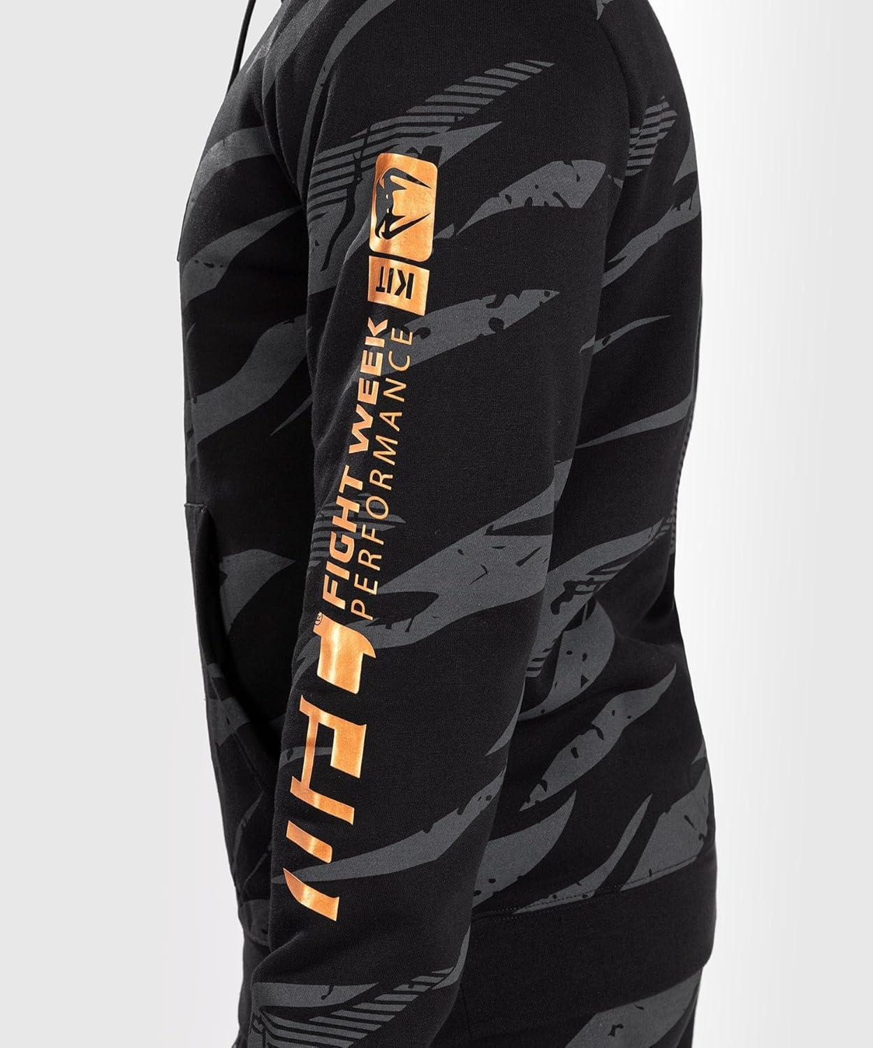 This men’s pullover hoodie is part of the latest high-octane collection from Venum and the UFC. The UFC Adrenaline by Venum collection features hardworking performance fabrics and thoughtful detailing, to keep pace with competing UFC athletes during Fight Week and through Fight Night. The UFC Adrenaline by Venum Fight Week Men’s Pullover Hoodie in Desert Camo features Venum and UFC logo detailing in bronze on the chest, shoulder and down the full length of the left arm.The kangaroo style front pocket and drawstring hood matches perfectly with other lifestyle pieces from the same collection.